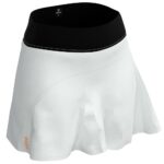 Falda de alto rendimiento para mujer en color blanco-negro con short interior naranja con bolsillo guardapelos y detalles en vinilo impreso.Falda técnica Alkharj obbe fabricada con la tecnología Eltech-Dry que mejora el rendimiento del deportista. Estructura bi-elástica con una excelente cobertura y adaptabilidad para una mayor comodidad.Tejido con control de la humedad, secado rápido y altamente transpirable
